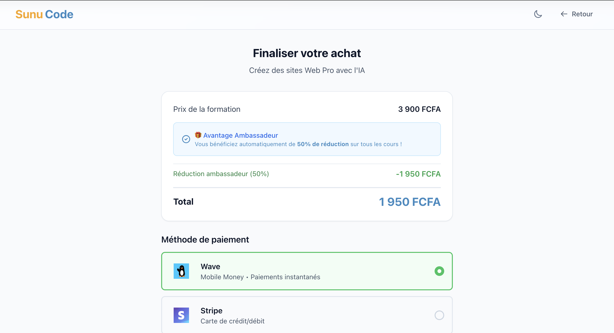 - Après paiement réussi, vous revenez automatiquement sur Sunu Code